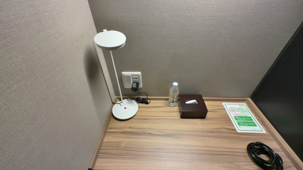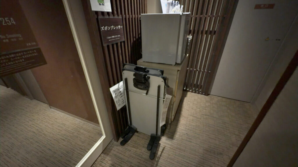 宿泊エリアにズボンプレッサー、保冷剤(冷やし枕)、ブランケットが置いてあります。