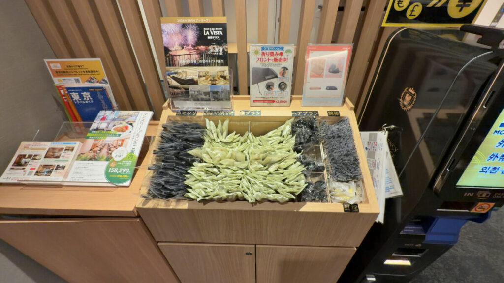 - アメニティー置き場:歯ブラシ(ミニ歯磨き粉)、ヘアブラシ、カミソリ、綿棒、耳栓、子供用館内着