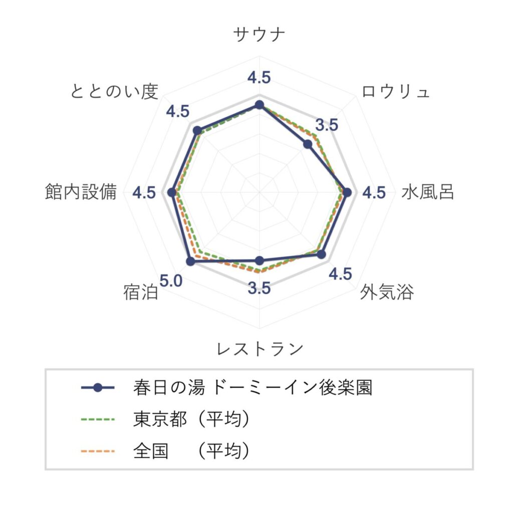 春日の湯 ドーミーイン後楽園の評価は「東京都サウナ施設の平均値」と「全国サウナ施設の平均値」を超える結果となりました。