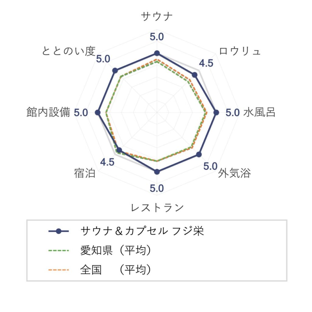 サウナ&カプセル フジ栄の評価は「全国サウナ施設の平均値」と「愛知県サウナ施設の平均値」を超える結果となりました。