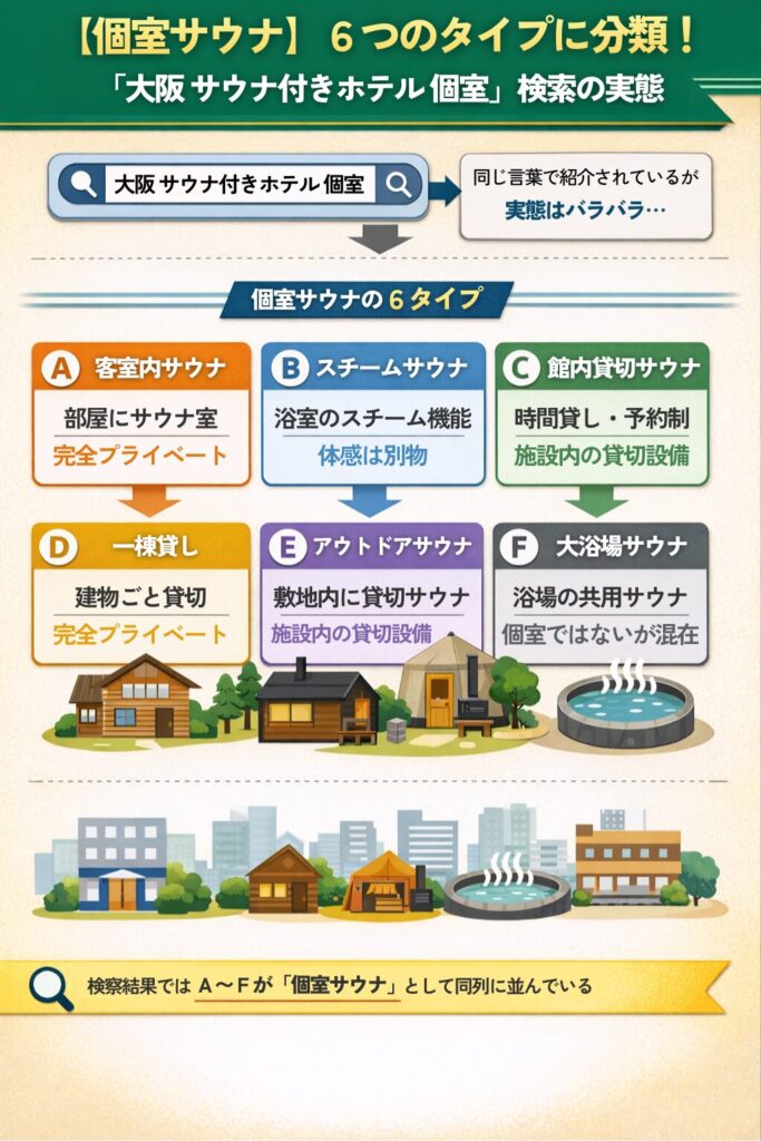 「サウナ付きホテル」と検索して出てくる施設の大半は、大浴場サウナ(タイプF)です。検索結果=個室とは限らない点に注意が必要です。