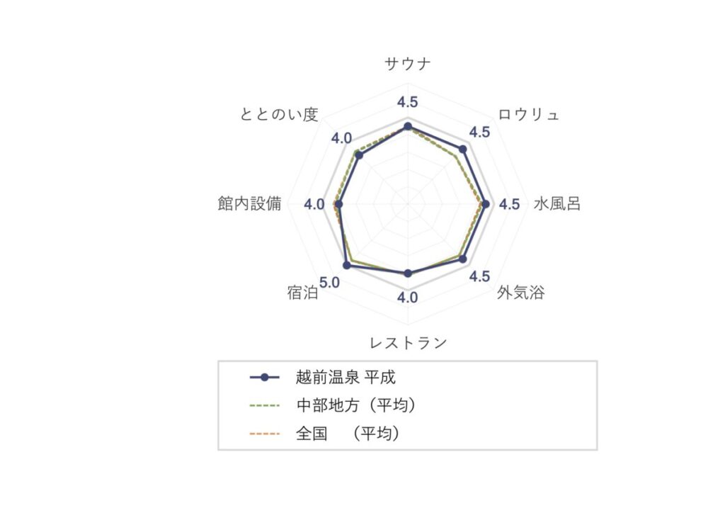 越前温泉 平成の評価は「中部地方サウナ施設の平均値」と「全国サウナ施設の平均値」を超える結果となりました。