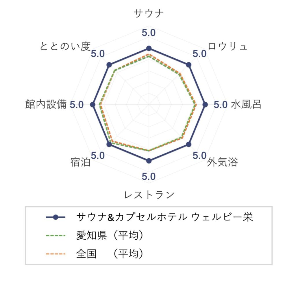 サウナ&カプセルホテル ウェルビー栄は「全国サウナ施設の平均値」と「愛知県サウナ施設の平均値」をともに上回り、満点評価を獲得しました。